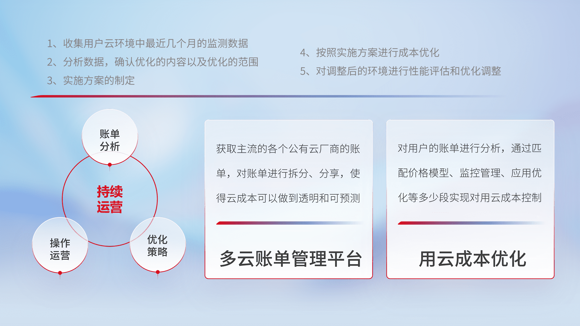 通过多云纳管,,以统一的资源数据模型把客户的云资源进行抽象和封装,,,,进而实现对多云资源的统一操作,,保障云资源管理的可靠性、、稳定性与可用性。。量身定制化运维内容,,,,配置、、、开发运维、、、、补丁管理、、备份、、、监控、、认证和访问管理、、、审计和日常巡检等,,,保障在用云过程中的可靠度,,,稳定度以及高可用率。。。。
