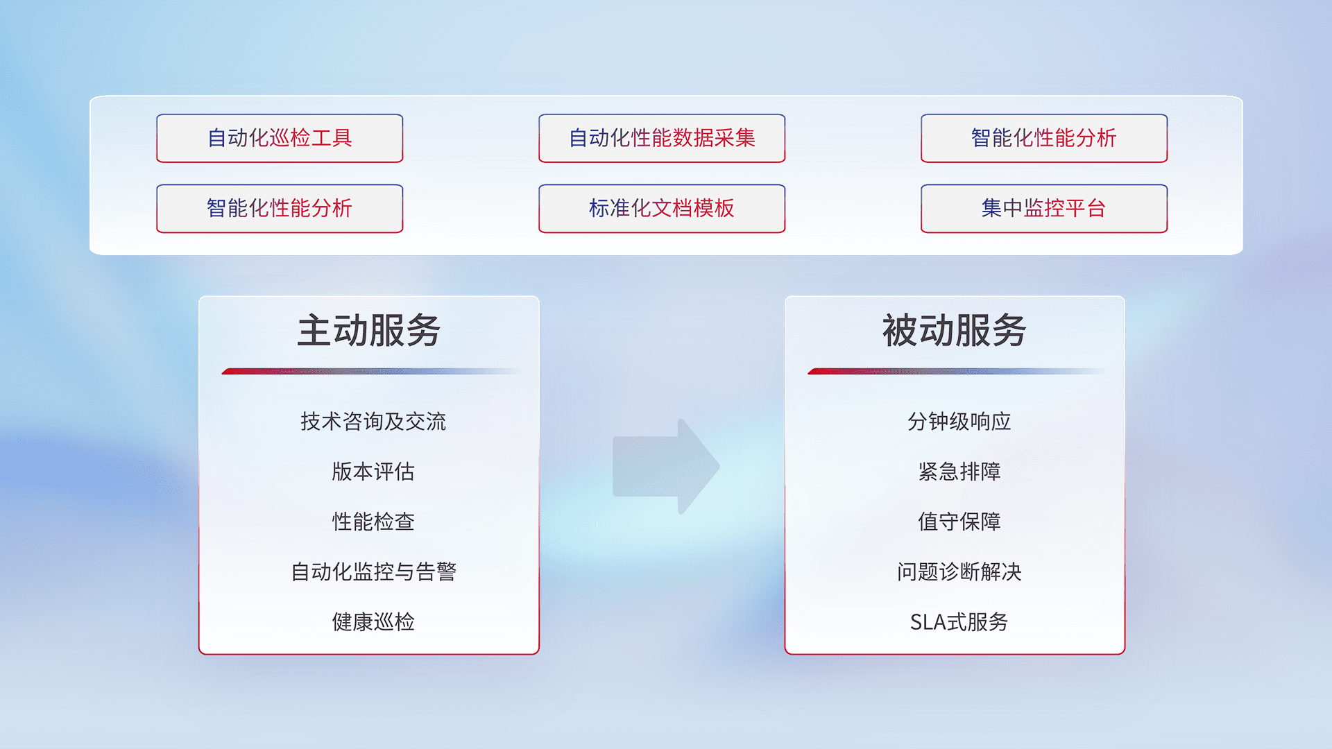 智能化工具和标准化文档,,保障服务质量,,,,提供主动服务(包含技术咨询、、、版本评估、、、性能检查、、自动化监控与告警、、、、健康巡检)和被动服务包含(分钟级响应、、、紧急排障、、值守保障、、、问题诊断解决、、、SLA服务)。。。